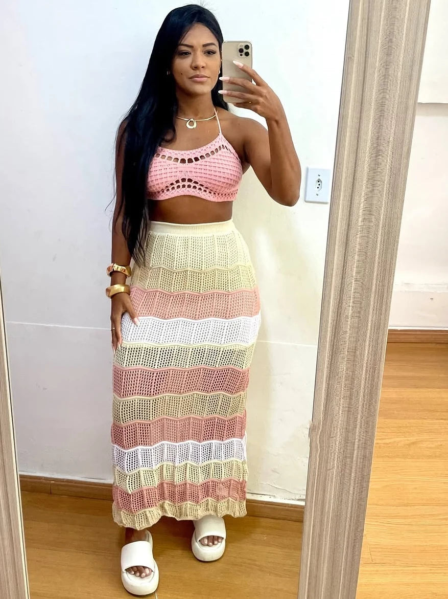 Women's Set Strap Sleeveless Crop Top + bodycon midi maxi long Skirt 2025 Beach Two 2Piece Set