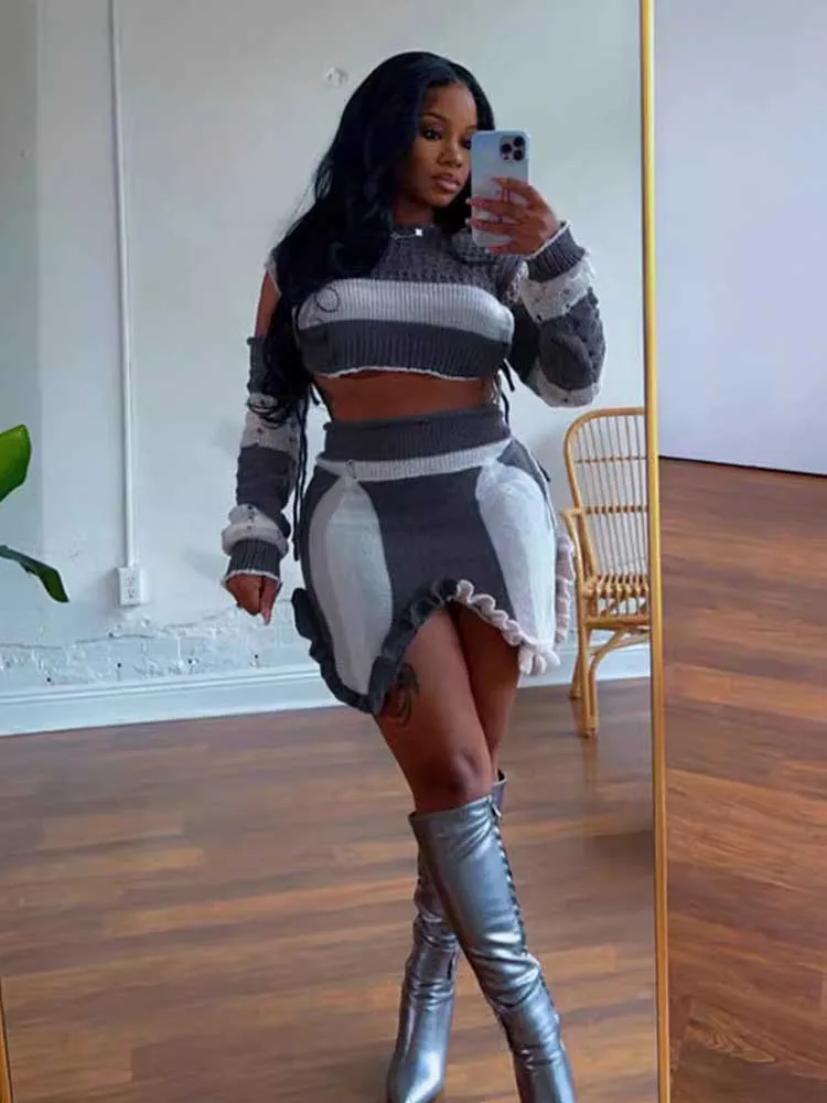 Elegant Women's Sets Autumn Long Sleeve Suit 2 Pieces Knitted Hollow Out Sexy Skirt and Top Outfit Wholesale Dropshipping