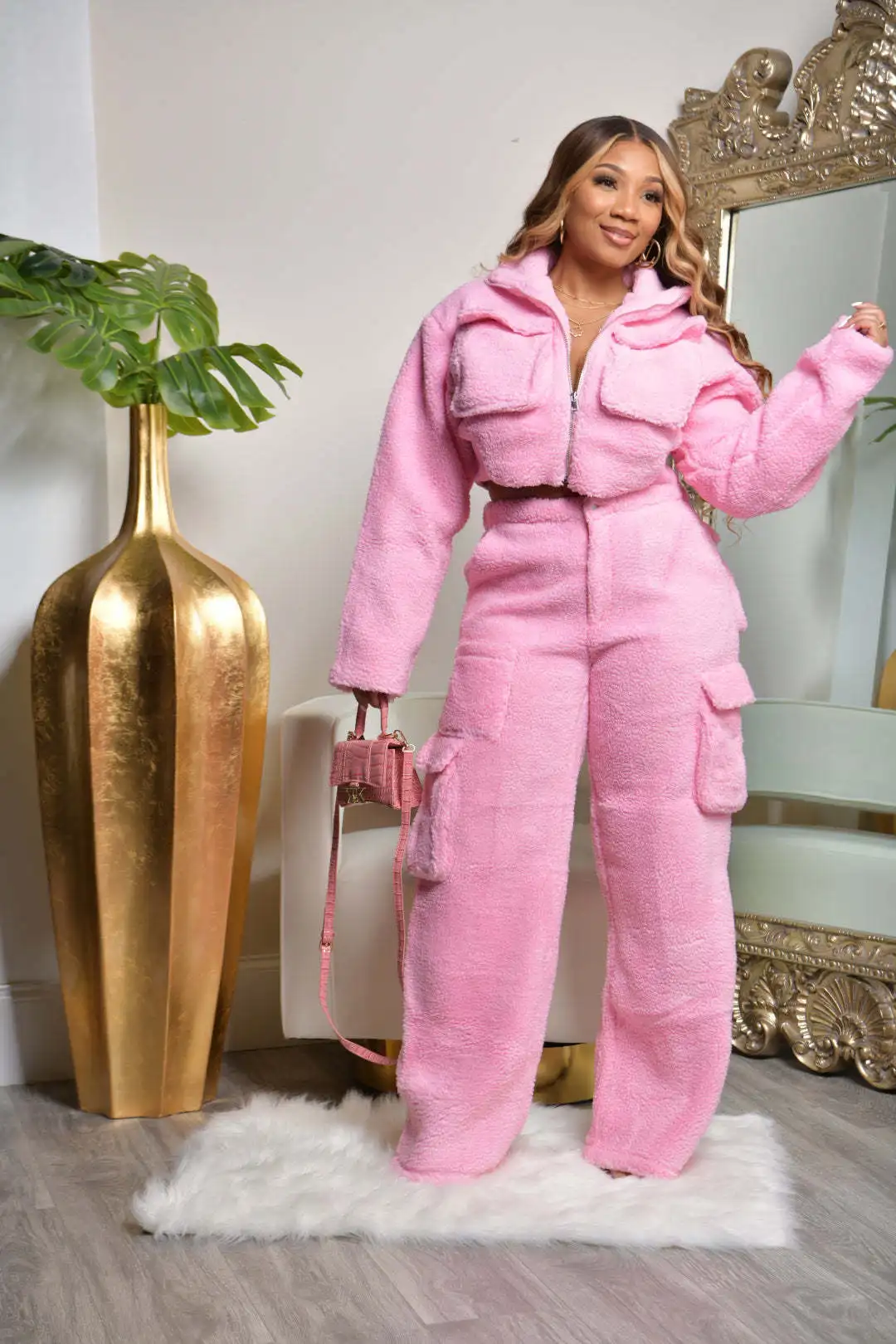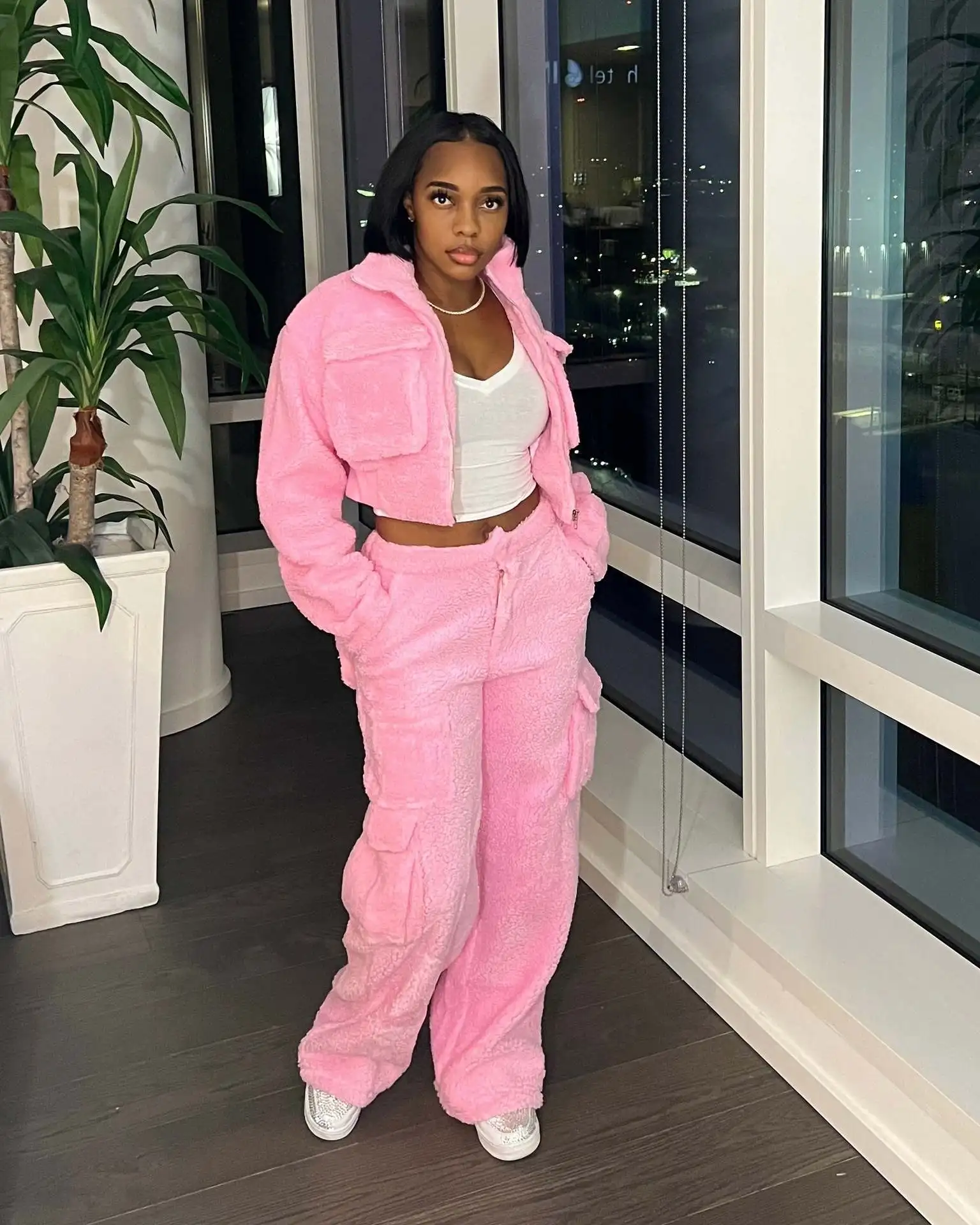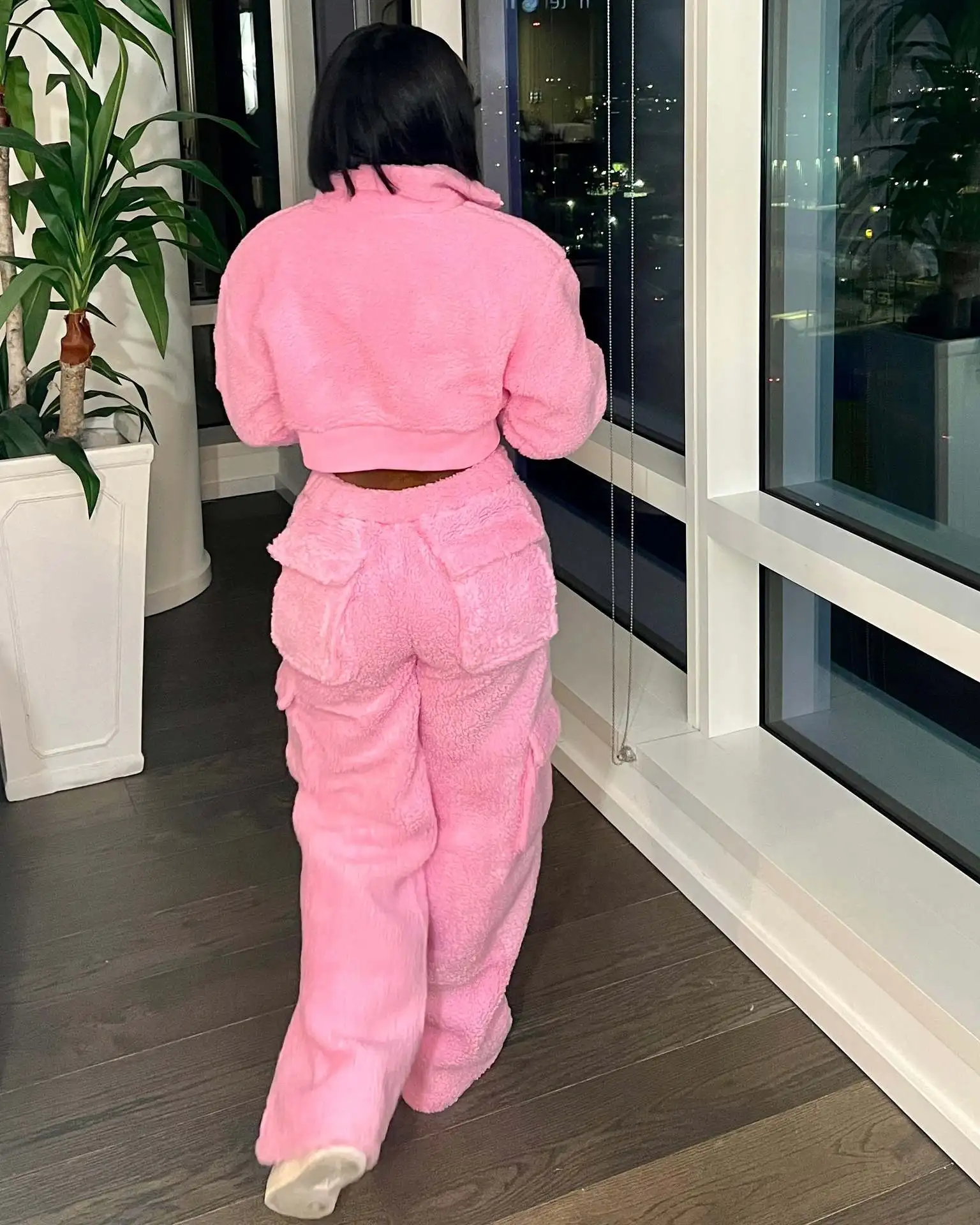 This is a two-piece winter set featuring a long sleeve short coat and matching cargo pants. | ||||