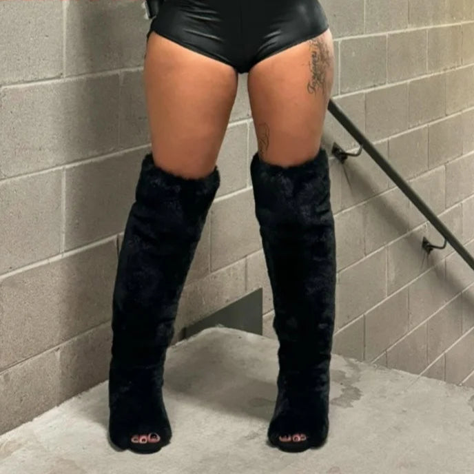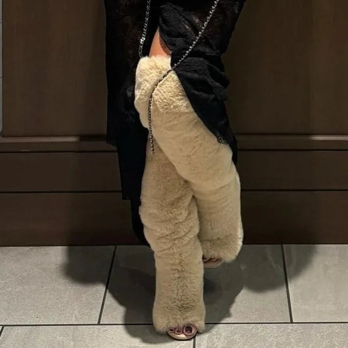 Spoken Dreams: White Fur Thigh High Warm Stiletto Heels